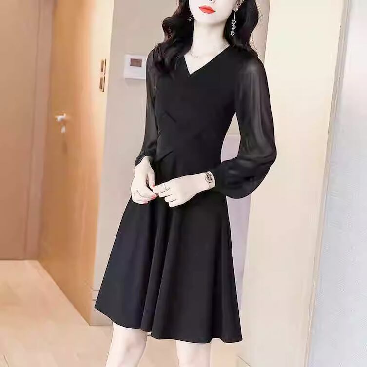 【送料無料】 レディース ドレス パーティードレス ワンピース ミドル丈 ミディアム丈 シアー 透け感 スタイルアップ ふんわり袖 シンプル 上品 Vネック 長袖 ブラック 黒 結婚式 2次会 お呼ばれ パーティー お食事会 ディナー ランチ お出かけ 春秋冬