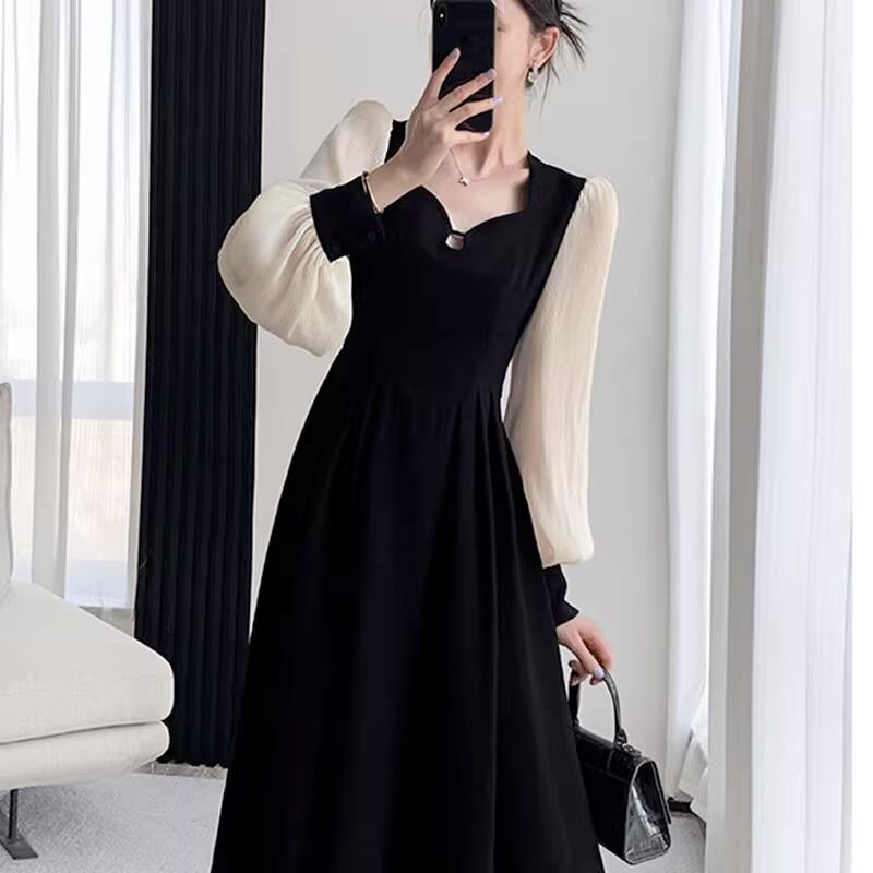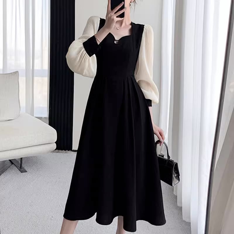 【送料無料】 レディース ドレス パーティードレス ワンピース ミモレ丈 ミドル丈 Aライン シンプル こなれ感 大人可愛い スタイルアップ 体型カバー カラー切り替え モノトーン スッキリ 上品 ブラック 長袖 黒 結婚式 2次会 お呼ばれ パーティー お食事会 ディナー ランチ お出かけ 秋冬