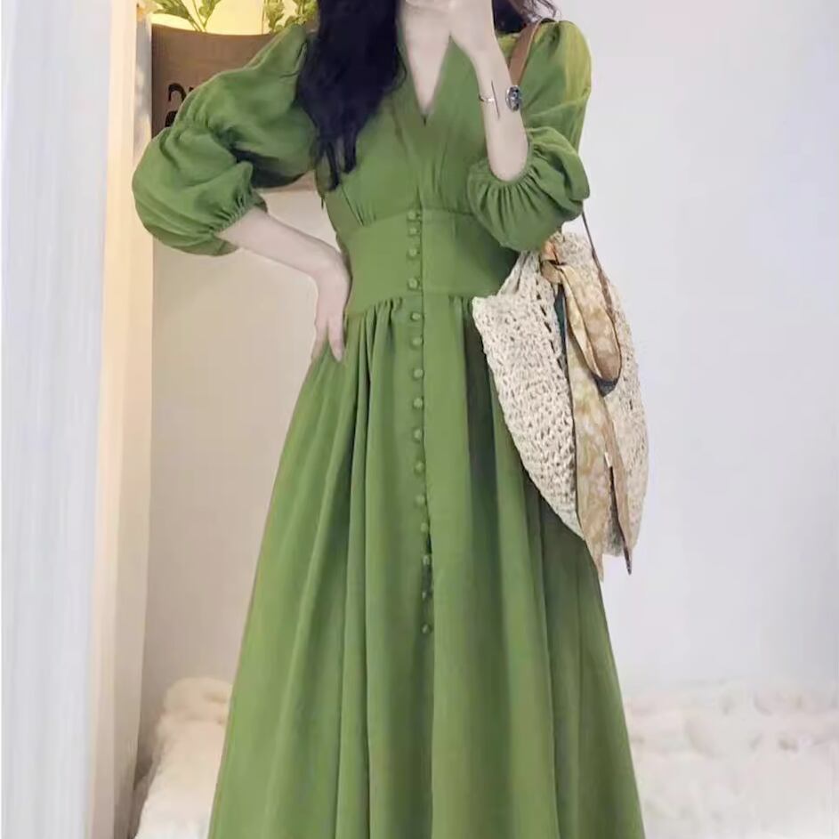 【送料無料】 レディース ワンピース Vネック ロング丈 Aライン こなれ感 キレイめ 大人かわいい スタイルアップ ふんわり袖 長袖 グリーン 緑 20代 30代 40代 通勤 通学 お出掛け 女子会 お呼ばれ 秋冬