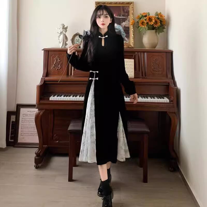 【送料無料】 レディース ドレス パーティードレス ワンピース ミドル丈 ミディアム丈 カラー切り替え モノトーン レース 抜け感 大人かわいい チャイナ風 レトロ Aライン ブラック ホワイト 黒 白 長袖 結婚式 2次会 お呼ばれ パーティー お食事会 ディナー ランチ お出かけ 秋冬