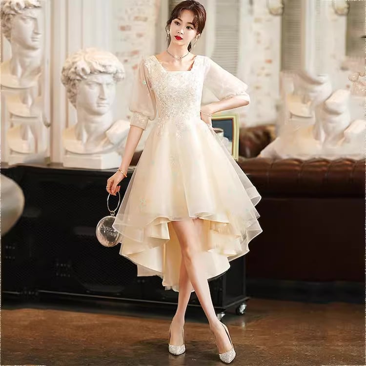 【送料無料】 レディース ドレス パーティードレス ワンピース ミドル丈 ミディアム丈 後ろ下がり ふんわり袖 スクエアネック キュート 大人かわいい フェミニン 上品 シンプル Aライン こなれ感 半端袖 5分袖 アイボリー 結婚式 2次会 お呼ばれ パーティー お食事会 ディナー ランチ お出かけ 秋冬