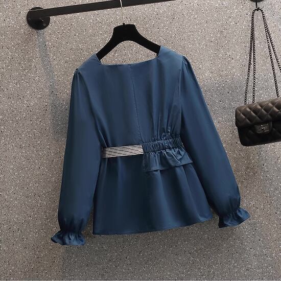 【送料無料】 レディース トップス ブラウス スクエアネック リボン キュート レトロ シンプル きれいめ こなれ感 体型カバー 大人かわいい 上品 長袖 ブルー 青 20代 30代 40代 通勤 通学 オフィス お出掛け 女子会 お呼ばれ 春秋冬