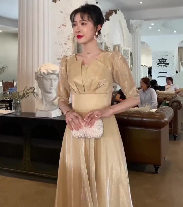 【送料無料】 レディース ドレス パーティードレス ワンピース ロング丈 マキシ丈 スクエアネック シンプル 上品 華やか 礼服 大人かわいい 半端袖 キャメル 結婚式 2次会 お呼ばれ パーティー お食事会 ディナー ランチ お出かけ 春秋冬