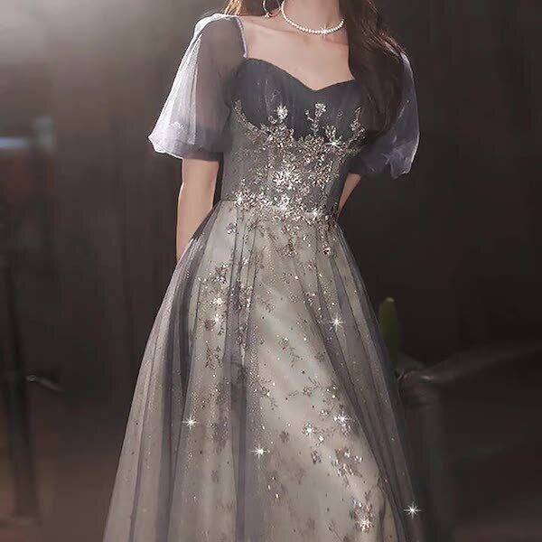 【送料無料】 レディース ドレス パーティードレス ワンピース ロング丈 マキシ丈 ふんわり袖 Aライン フラワー スクエアネック 大人かわいい 抜け感 半袖 グレー 結婚式 2次会 お呼ばれ パーティー お食事会 ディナー ランチ お出かけ 春秋冬