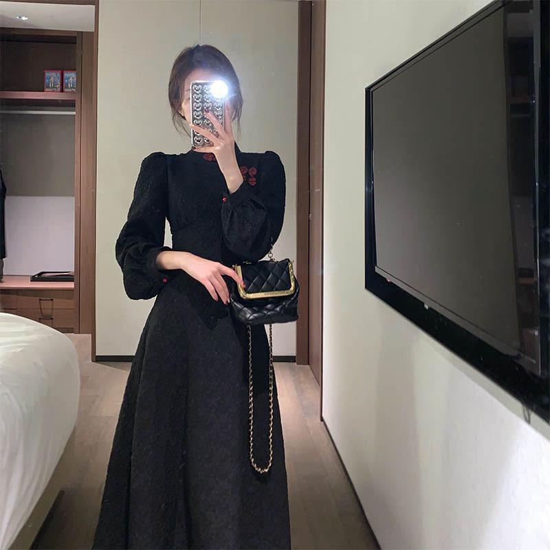 【送料無料】 レディース ドレス パーティードレス ワンピース ミドル丈 チャイナドレス風 Aライン 体型カバー スタイルアップ アシンメトリー シンプル 大人かわいい 長袖 ブラック 黒 結婚式 2次会 お呼ばれ パーティー お食事会 ディナー ランチ お出かけ 春秋冬