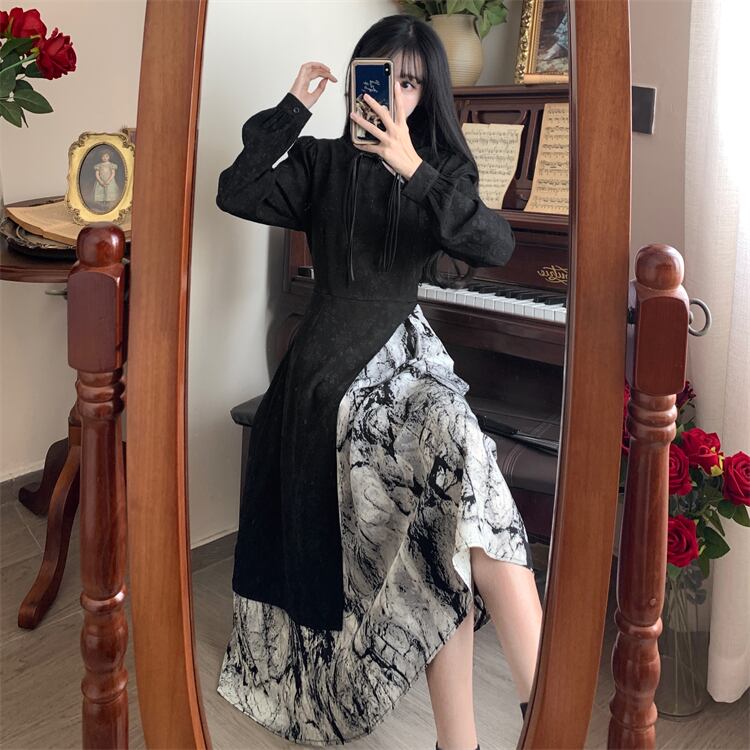 【送料無料】 レディース ワンピース カラー切り替え ドッキング モノトーン アシンメトリー こなれ感 大人かわいい シンプル きれいめ チャイナ風 ブラック 黒 20代 30代 40代 通勤 通学 オフィス お出掛け 女子会 お呼ばれ 春秋冬