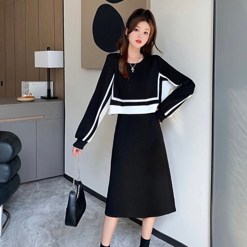 【送料無料】 レディース ワンピース ミドル丈 モノトーン フェイクレイヤード 体型カバー スタイルアップ こなれ感 大人かわいい シンプル カジュアル きれいめ ブラック ホワイト 黒 白 20代 30代 40代 通勤 通学 オフィス お出掛け 女子会 お呼ばれ 春秋冬