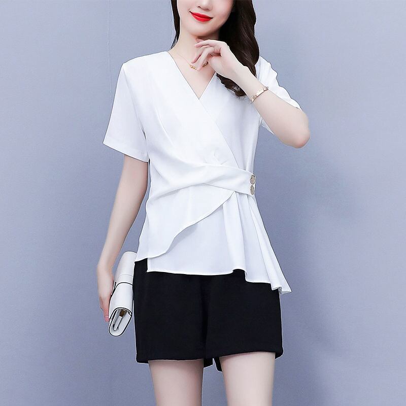 【送料無料】 レディース トップス ブラウス アシンメトリー カシュクール風 Vネック ウエストシェイプ 体型カバー スタイルアップ シンプル きれいめ こなれ感 大人かわいい 半袖 ホワイト ブラック 白 黒 20代 30代 40代 通勤 通学 オフィス お出掛け 女子会 お呼ばれ 春夏