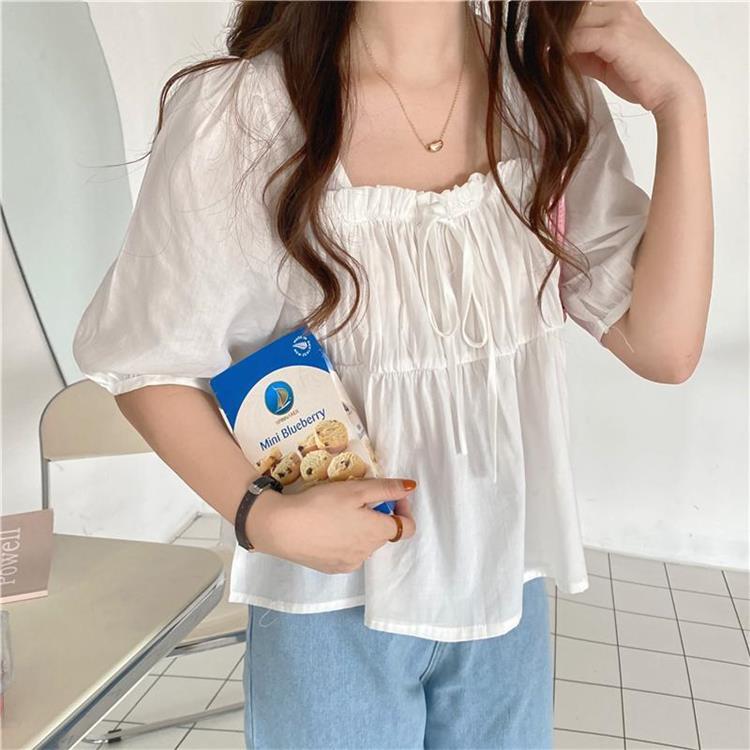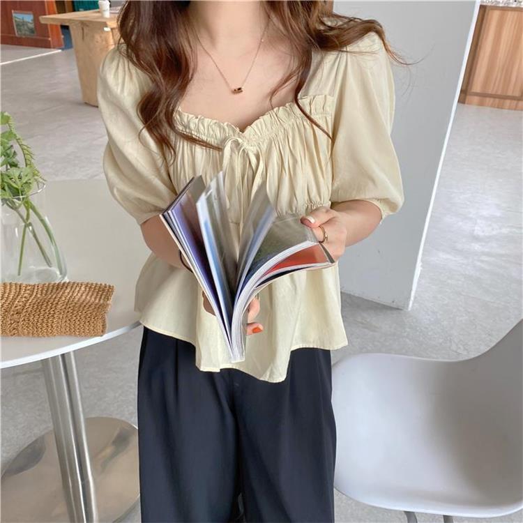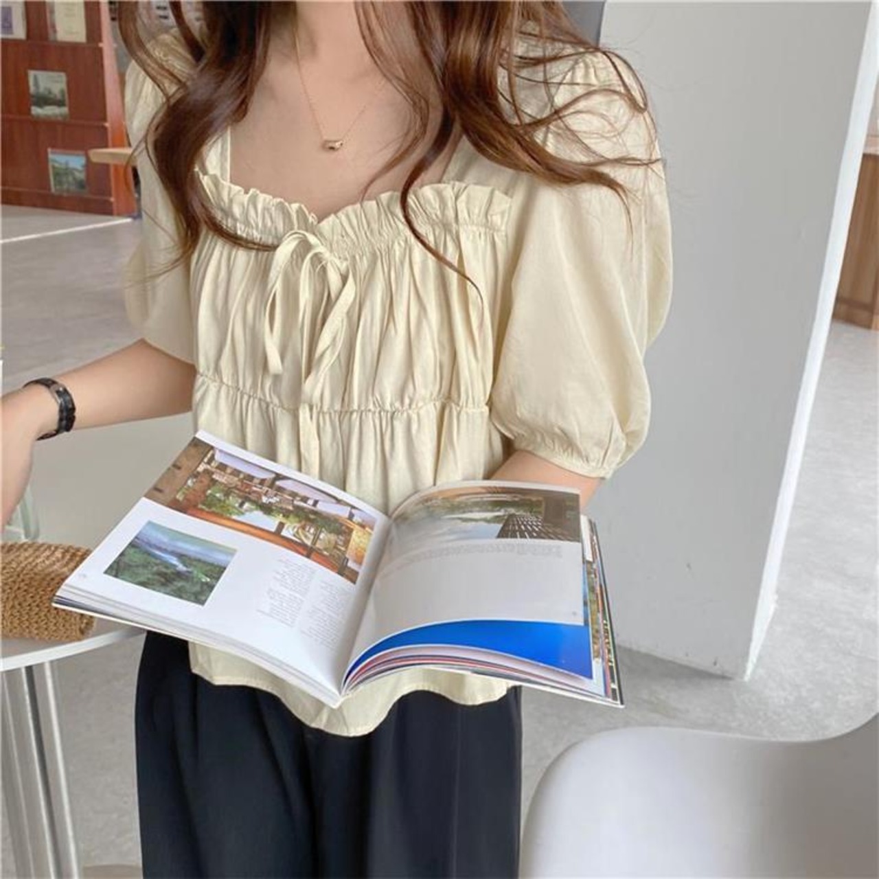 【送料無料】 レディース トップス ブラウス スクエアネック ギャザー リボン ふんわり袖 ショート丈 チュニック風 体型カバー キュート 大人かわいい シンプル きれいめ カジュアル 半袖 ベージュ ピンク グリーン ホワイト 20代 30代 40代 通勤 通学 オフィス お出掛け 女子会 お呼ばれ 春夏