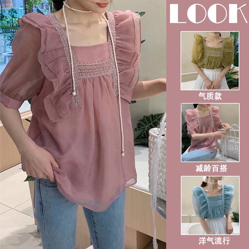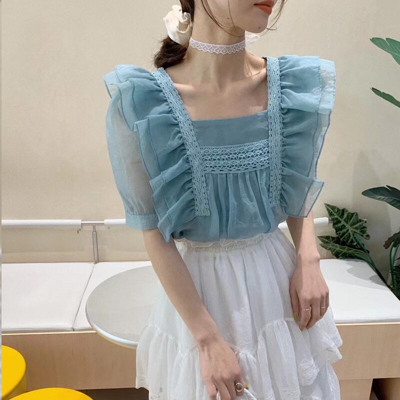 【送料無料】 レディース トップス ブラウス スクエアネック シアー フリル スウィート キュート ガーリー こなれ感 大人かわいい シンプル 上品 カジュアル キレイめ 体型カバー ふんわり袖 半袖 ピンク グリーン ブルー 緑 青 20代 30代 40代 通勤 通学 オフィス お出掛け 女子会 お呼ばれ 春夏