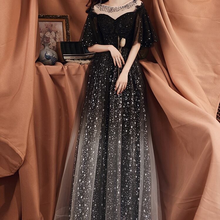 【送料無料】 レディース ドレス パーティードレス ワンピース ロング丈 マキシ丈 Aライン ふんわり袖 パフスリーブ ラメ レース 華やか ブラック 黒 結婚式 2次会 お呼ばれ パーティー お食事会 ディナー ランチ お出かけ 春夏