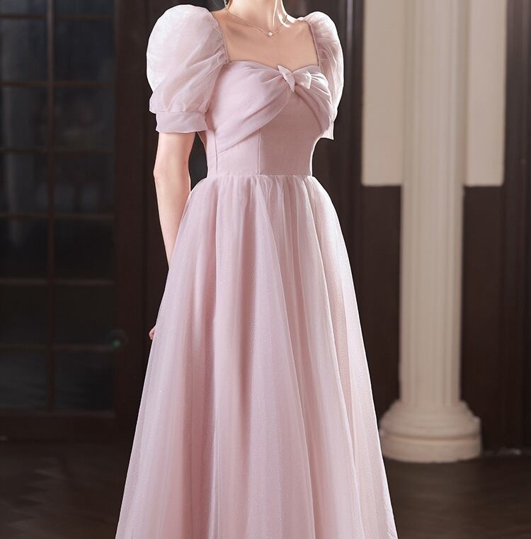 【送料無料】 レディース ドレス パーティードレス ワンピース ロング丈 マキシ丈 Aライン レース チュール スクエアネック ふんわり袖 バルーンスリーブ プリンセス 上品 キュート 大人かわいい リボン フェミニン 半袖 ピンク 結婚式 2次会 お呼ばれ パーティー お食事会 ディナー ランチ お出かけ 春夏