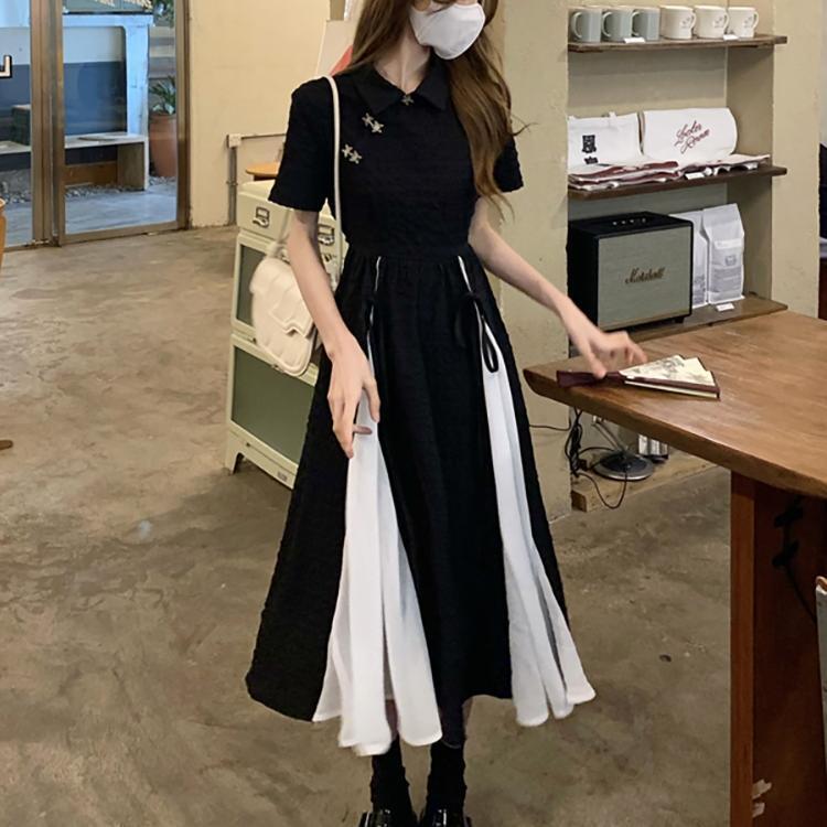 【送料無料】 レディース ワンピース モノトーン チャイナ風 ロング丈 カラー切り替え アシンメトリー こなれ感 大人かわいい シンプル カジュアル きれいめ 半袖 ブラック 20代 30代 40代 通勤 通学 オフィス お出掛け 女子会 お呼ばれ 春夏