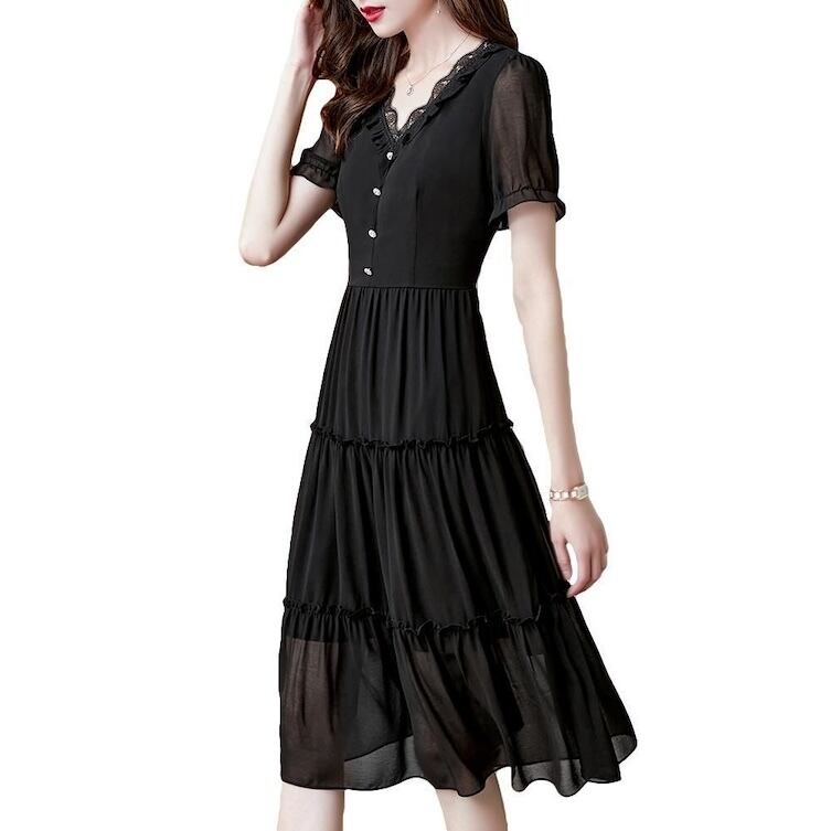 【送料無料】 レディース ドレス パーティードレス ワンピース ミドル丈 Vネック Aライン ティアード 透け感 シアー シンプル 上品 スタイルアップ こなれ感 大人かわいい 半袖 レッド ブラック 赤 黒 結婚式 2次会 お呼ばれ パーティー お食事会 ディナー ランチ お出かけ 春夏