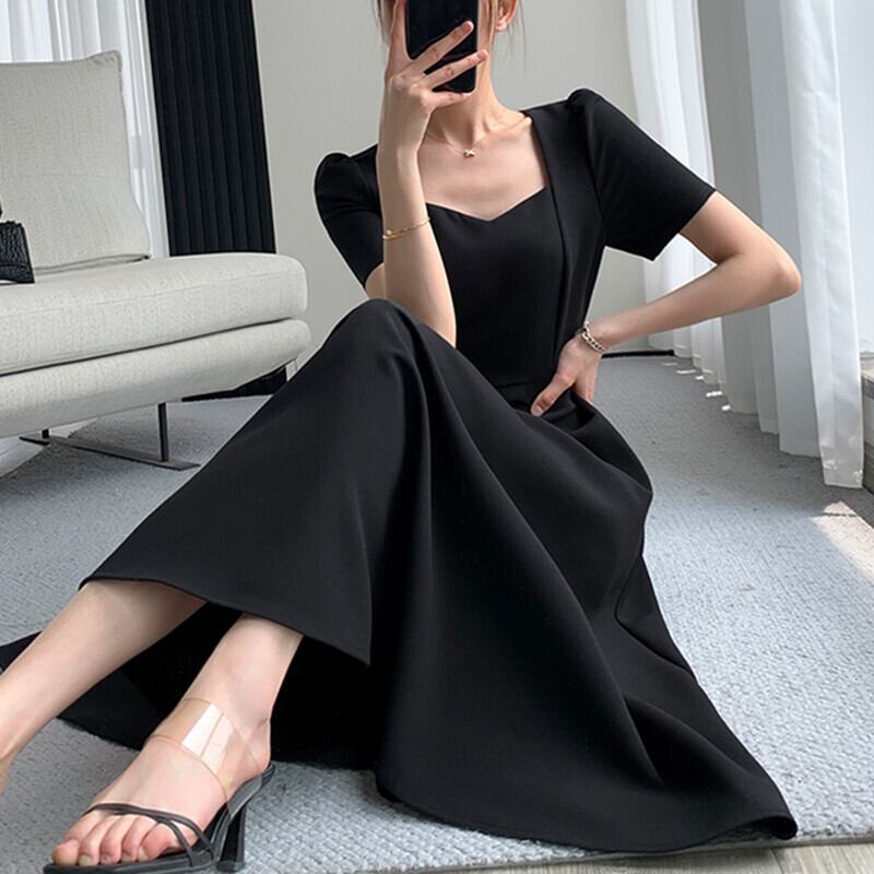 【送料無料】 レディース ドレス パーティードレス ワンピース ロング丈 ミモレ丈 ミディアム丈 スクエアネック Aライン シンプル 上品 きれいめ こなれ感 大人かわいい 半袖 ブラック 黒 結婚式 2次会 お呼ばれ パーティー お食事会 ディナー ランチ お出かけ 春夏