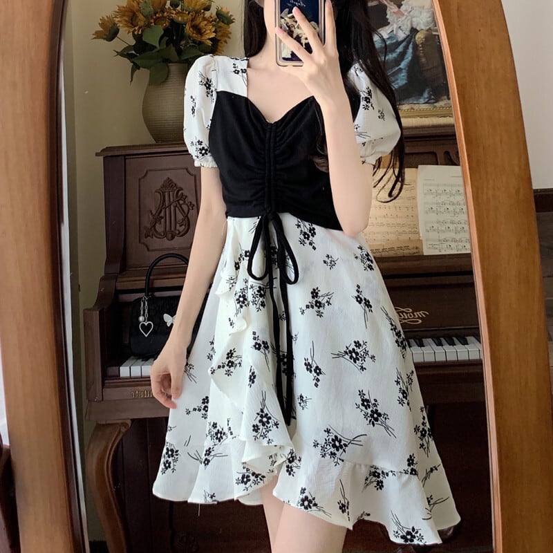 【送料無料】 レディース ワンピース Vネック ショート丈 カラー切り替え ふんわり袖 プリント 透け感 レース シアー モノトーン シンプル こなれ感 大人かわいい アシンメトリー 抜け感 アイボリー 20代 30代 40代 通勤 通学 オフィス お出掛け 女子会 お呼ばれ 春夏