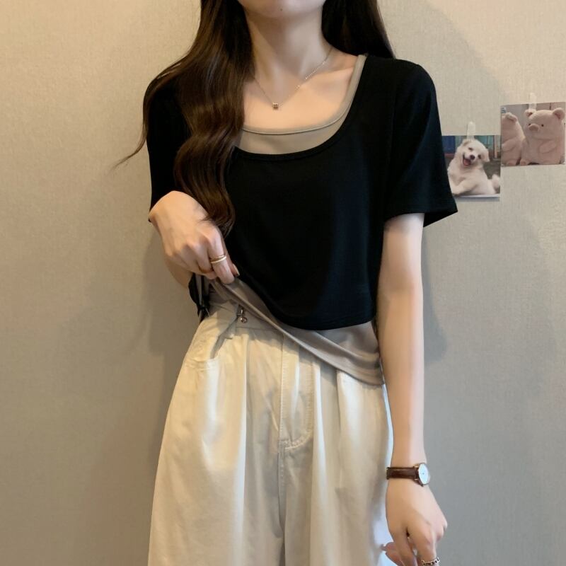 【送料無料】 レディース トップス カットソー クルーネック スクエアネック 重ね着風 フェイクレイヤード アシンメトリー シンプル カジュアル こなれ感 大人かわいい 半袖 ブラック カーキ ホワイト ベージュ 20代 30代 40代 通勤 通学 オフィス お出掛け 女子会 お呼ばれ 春夏