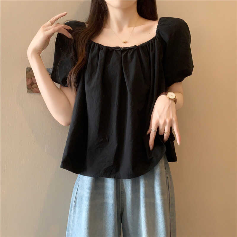 【送料無料】 レディース トップス ブラウス スクエアネック チュニック ふんわり袖 体型カバー キュート こなれ感 シンプル きれいめ 大人かわいい 後ろリボン パープル ブラック 紫 黒 半袖 20代 30代 40代 通勤 通学 オフィス お出掛け 女子会 お呼ばれ 春夏