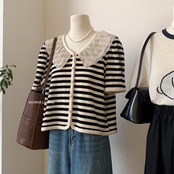 【送料無料】 レディース トップス ボーダー クルーネック レース パイピング キュート シンプル 抜け感 レトロ こなれ感 大人かわいい 半袖 ブラック 20代 30代 40代 通勤 通学 オフィス お出掛け 女子会 お呼ばれ 春夏