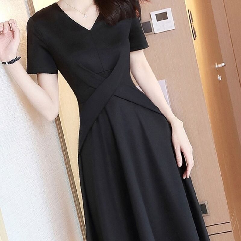 【送料無料】 レディース ドレス パーティードレス ワンピース ミドル丈 シンプル デザイン ウエストシェイプ スタイルアップ 大人かわいい 上品 きれいめ 半袖 ブラック 黒 結婚式 2次会 お呼ばれ パーティー お食事会 ディナー ランチ お出かけ 春夏
