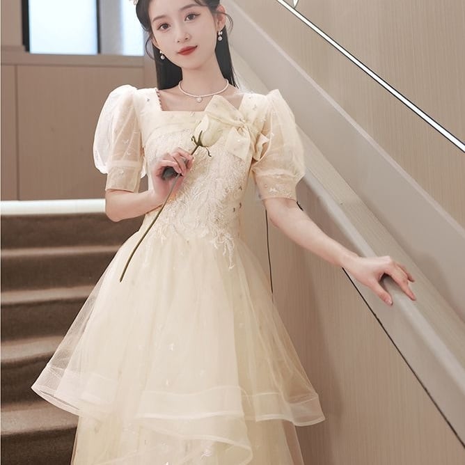 【送料無料】 レディース ドレス パーティードレス ワンピース ロング丈 マキシ丈 Aライン リボン キュート プリンセス 華やか ふんわり袖 バルーンスリーブ アイボリー 半袖 結婚式 2次会 お呼ばれ パーティー お食事会 ディナー ランチ お出かけ 春夏