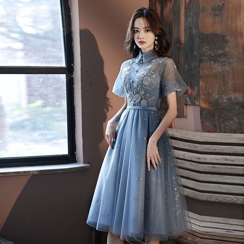 【送料無料】 レディース ドレス パーティードレス ワンピース ミドル丈 ミディアム丈 Aライン レース 透け感 シアー シンプル きれいめ 上品 ノーブル 大人かわいい 半袖 ブルー 結婚式 2次会 お呼ばれ パーティー お食事会 ディナー ランチ お出かけ 春夏