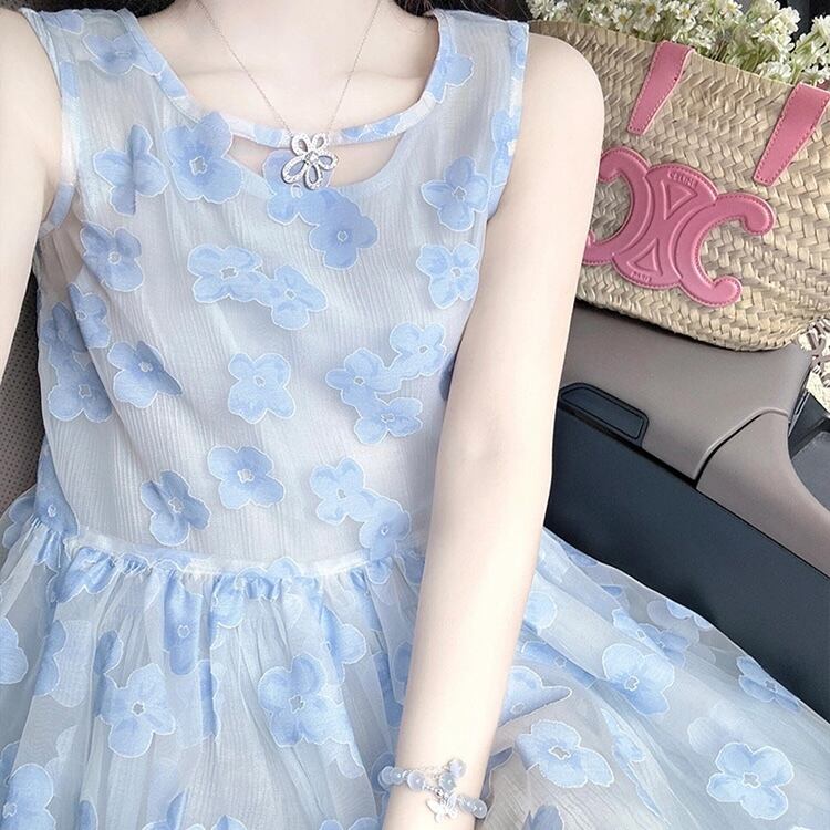 【送料無料】 レディース ワンピース Aライン ミドル丈 ミディアム丈 フラワー ゆったりサイズ 体型カバー シアー 透け感 こなれ感 大人可愛い ノースリーブ ブルー 20代 30代 40代 通勤 通学 オフィス お出掛け 女子会 お呼ばれ 春夏