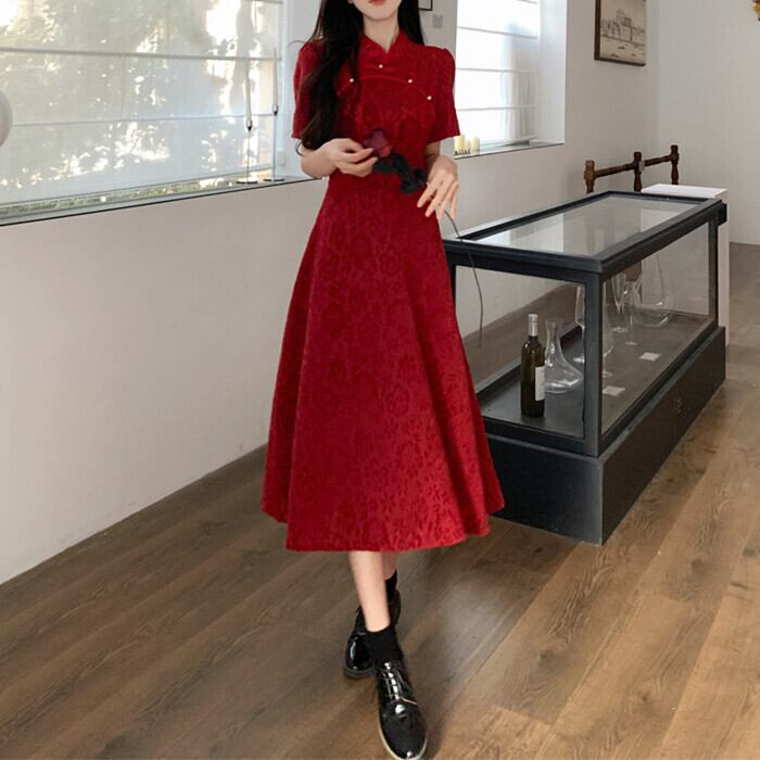【送料無料】 レディース ワンピース シンプル チャイナ風 ミドル丈 ミディアム丈 Aライン きれいめ こなれ感 大人かわいい 半袖 スタイルアップ レッド 赤 20代 30代 40代 通勤 通学 オフィス お出掛け 女子会 お呼ばれ 春夏