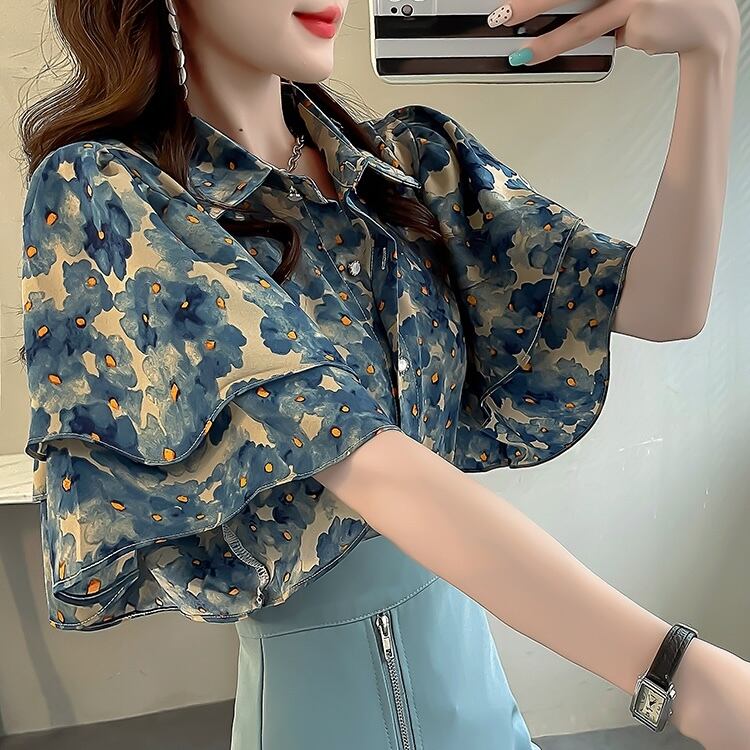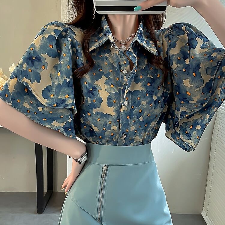【送料無料】 レディース トップス ブラウス ふんわり袖 二の腕カバー 体型カバー ベルスリーブ フラワー ボタニカル 抜け感 大人かわいい 上品 こなれ感 プリント 半袖 ブルー 青 20代 30代 40代 通勤 通学 オフィス お出掛け 女子会 お呼ばれ 春夏