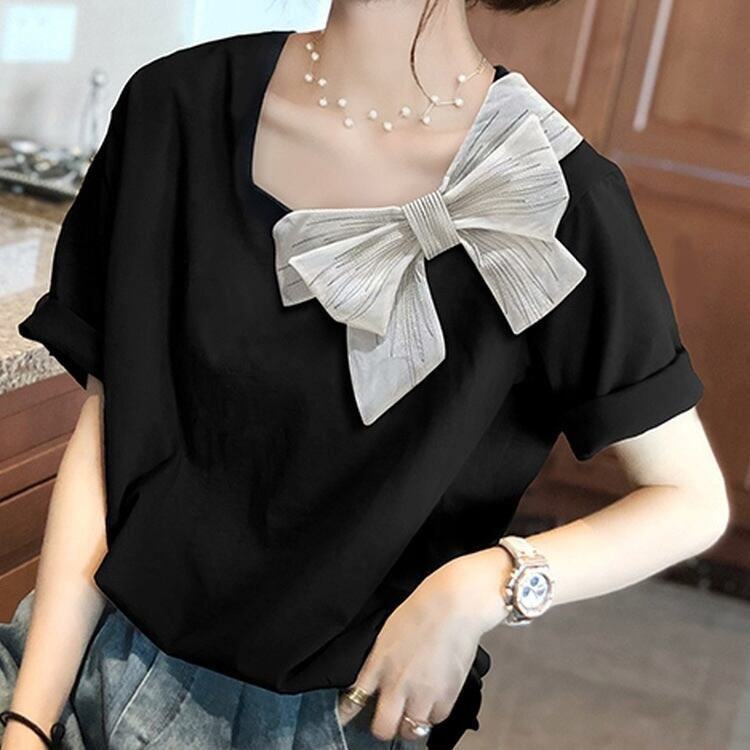 【送料無料】 レディース トップス カットソー アシンメトリー リボン キュート 大人かわいい 抜け感 モノトーン シンプル カジュアル きれいめ こなれ感 半袖 ブラック 黒 20代 30代 40代 通勤 通学 オフィス お出掛け 女子会 お呼ばれ 春夏