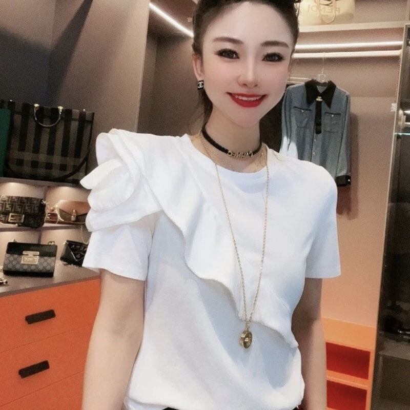 【送料無料】 レディース トップス カットソー アシンメトリー フリル デコレーション フラワー 上品 大人かわいい シンプル きれいめ スタイルアップ 半袖 ブラック ホワイト 黒 白 20代 30代 40代 通勤 通学 オフィス お出掛け 女子会 お呼ばれ 春夏