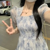 【送料無料】 レディース ドレス パーティードレス ワンピース ロング丈 ミモレたけ プリント ふんわり袖 ティアード シアー フラワー 大人かわいい キュート 半袖 ブルー 青 結婚式 2次会 お呼ばれ パーティー お食事会 ディナー ランチ お出かけ 春夏