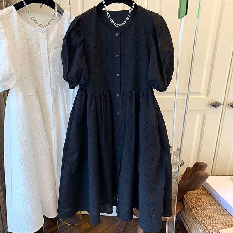 【送料無料】 レディース ワンピース ミドル丈 ミディアム丈 ふんわり袖 二の腕カバー 体型カバー シンプル きれいめ こなれ感 キュート 大人かわいい レトロ ベーシック 半袖 ブラック ホワイト 黒 白 20代 30代 40代 通勤 通学 オフィス お出掛け 女子会 お呼ばれ 春夏