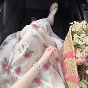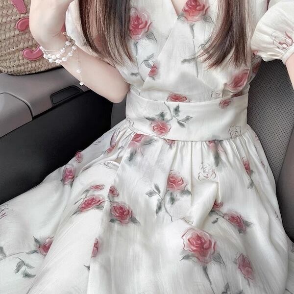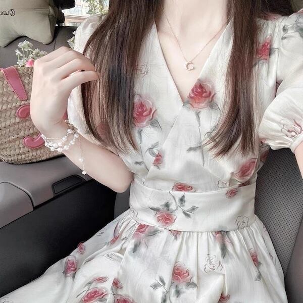 【送料無料】 レディース ワンピース カシュクール風 アシンメトリー ふんわり袖 Aライン ミドル丈 ミディアム丈 プリント フラワー 大人かわい シンプル きれいめ レトロ フェミニン 半袖 アイボリー 20代 30代 40代 通勤 通学 お出掛け 女子会 お呼ばれ 春夏