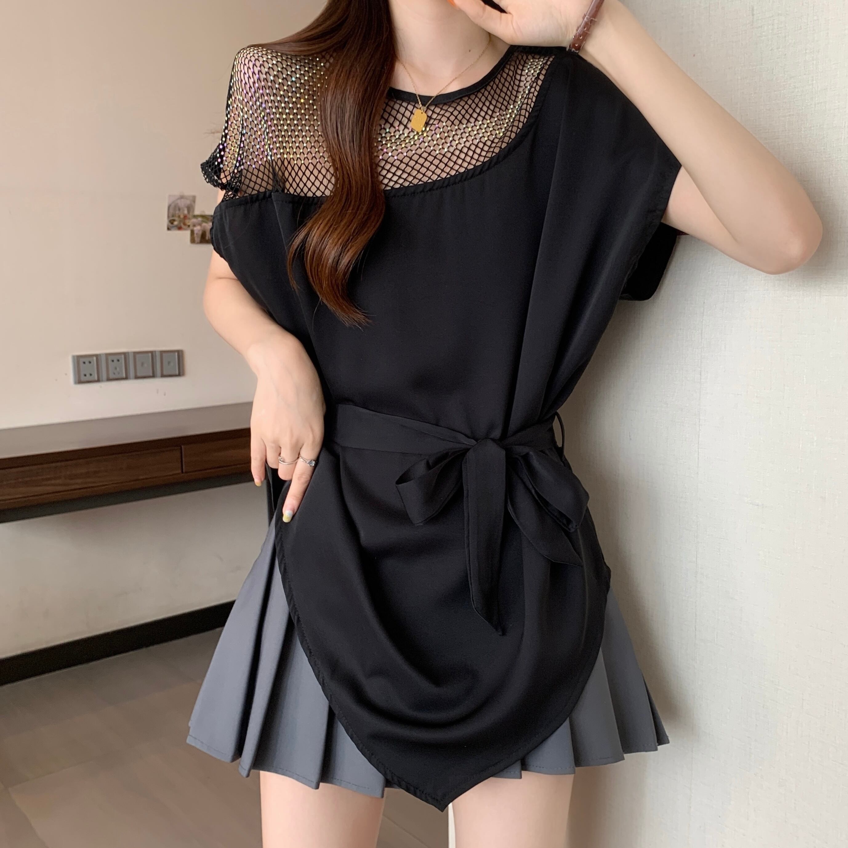 【送料無料】 レディース トップス ブラウス アシメトリー フレンチスリーブ シアー 透け感 体型カバー こなれ感 大人可愛い ウエストシェイプ スタイルアップ ロング丈 シンプル カジュアル モノトーン 半袖 千鳥格子 ブラック 黒 20代 30代 40代 通勤 通学 オフィス お出掛け 女子会 お呼ばれ 春夏