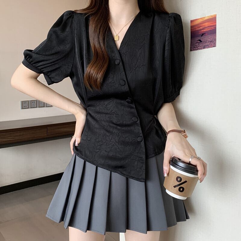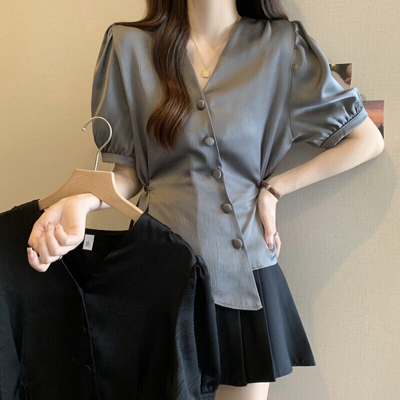 【送料無料】 レディース トップス ブラウス アシンメトリー ふんわり袖 Vネック 体型カバー ウエストシェイプ スタイルアップ こなれ感 大人かわいい シンプル きれいめ 半袖 グレー ブラック 黒 20代 30代 40代 通勤 通学 オフィス お出掛け 女子会 お呼ばれ 春夏