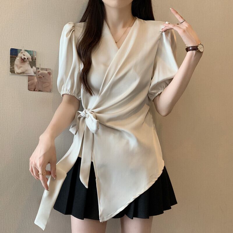 【送料無料】 レディース トップス ブラウス カシュクール風 アシンメトリー リボン ギャザー こなれ感 シンプル きれいめ 大人かわいい ふんわり袖 二の腕カバー 半袖 ベージュ ブラック 黒 20代 30代 40代 通勤 通学 オフィス お出掛け 女子会 お呼ばれ 春夏