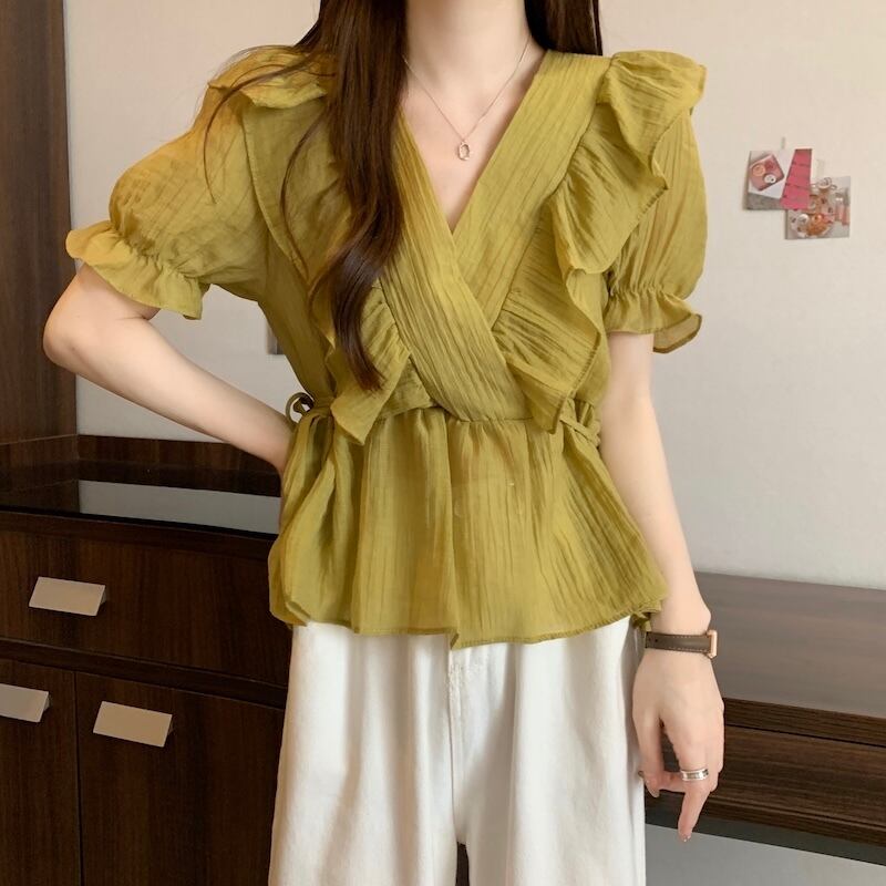 【送料無料】 レディース トップス ブラウス フリル Vネック こなれ感 アシンメトリー カシュクール風 スタイルアップ 抜け感 大人かわいい 半袖 グリーン ベージュ 緑 20代 30代 40代 通勤 通学 オフィス お出掛け 女子会 お呼ばれ 春夏