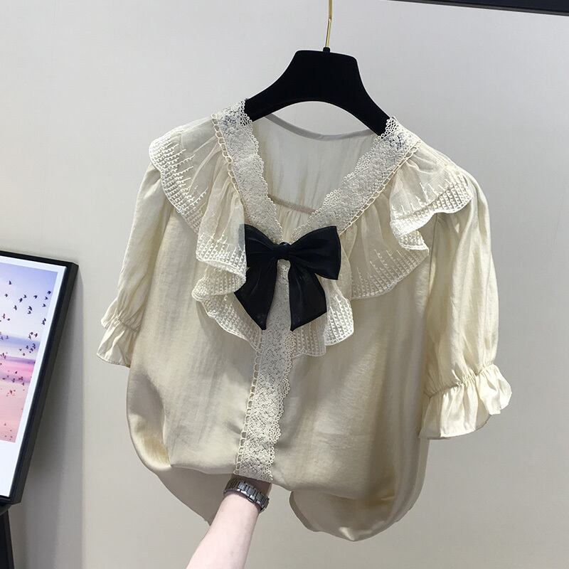 【送料無料】 レディース トップス ブラウス シアー 透け感 Vネック レース フリル キュート リボン ふんわり袖 二の腕カバー 大人かわいい 半袖 ブラウン ベージュ ピンク 20代 30代 40代 通勤 通学 オフィス お出掛け 女子会 お呼ばれ 春夏