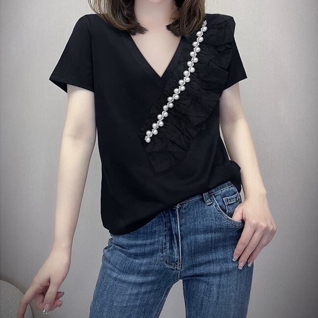 【送料無料】 レディース トップス カットソー Vネック シンプル きれいめ こなれ感 フリル パール モノトーン 大人かわいい スタイルアップ 半袖 ブラック 黒 20代 30代 40代 通勤 通学 オフィス お出掛け 女子会 お呼ばれ 春夏
