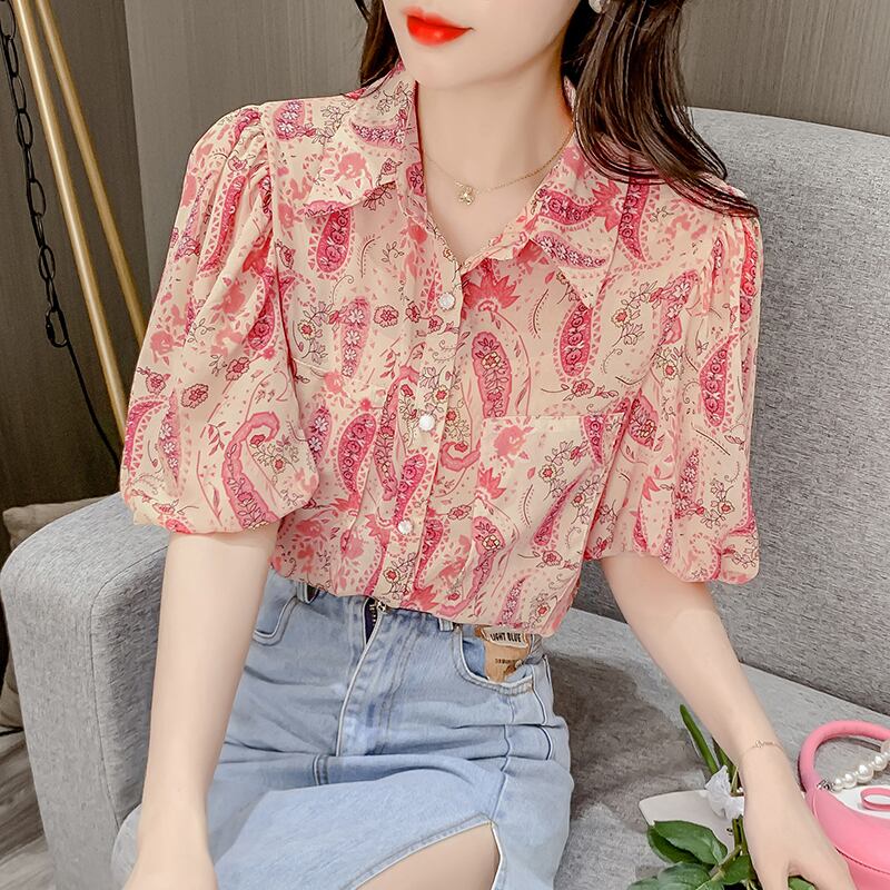 【送料無料】 レディース トップス ブラウス ふんわり袖 プリント ペイズリー 透け感 こなれ感 シンプル カジュアル きれいめ 大人かわいい 抜け感 半袖 グリーン ピンク 20代 30代 40代 通勤 通学 オフィス お出掛け 女子会 お呼ばれ 春夏