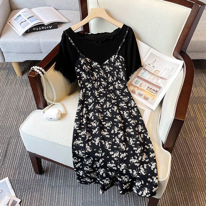 【送料無料】 レディース ワンピース ミドル丈 ミディアム丈 フェイクレイヤード Aライン ドッキング 素材組み合わせ プリント フラワー 小花柄 モノトーン こなれ感 グレー ブラック 20代 30代 40代 通勤 通学 オフィス お出掛け 女子会 お呼ばれ 春夏