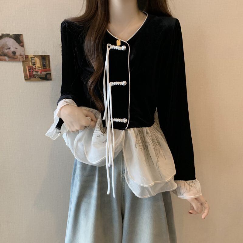【送料無料】 レディース トップス ブラウス モノトーン 異素材組み合わせ ドッキング レース フリル カラー切り替え 体型カバー 抜け感 シンプル キレイめ カジュアル 大人かわいい こなれ感 長袖 ブラック黒20代 30代 40代 通勤 通学 オフィス お出掛け 女子会 お呼ばれ 秋冬