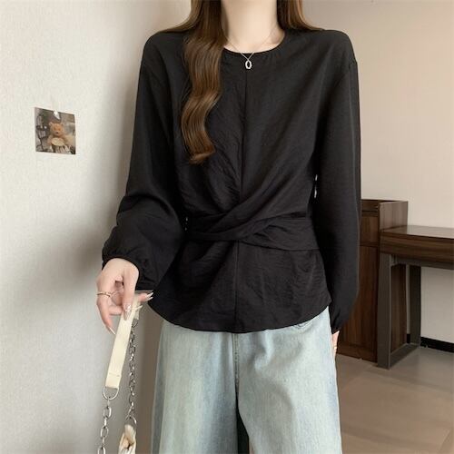 【送料無料】 レディース トップス ブラウス シンプル カジュアル こなれ感 アシンメトリー ウエストシェイプ 体型カバー スタイルアップ 大人かわいい ふんわり袖 長袖 グレー ブラック 黒 20代 30代 40代 通勤 通学 オフィス お出掛け 女子会 お呼ばれ 秋冬