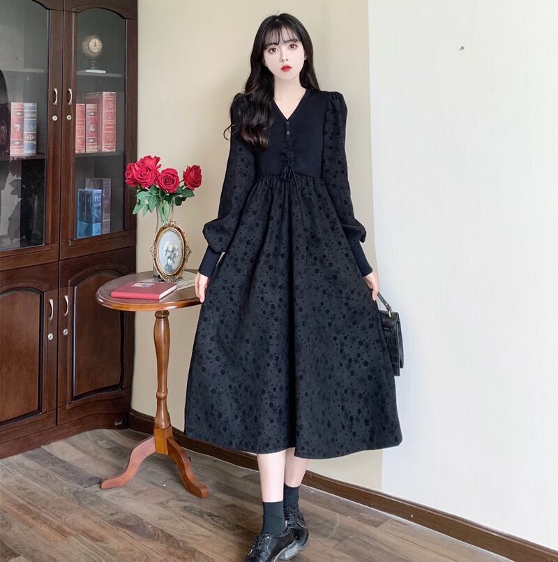 【送料無料】 レディース ワンピース ミドル丈 ミディアム丈 ドッキング 素材組み合わせ Aライン Vネック フラワー 小花柄 こなれ感 大人かわいい 長袖 カーキ ブラック 黒 20代 30代 40代 通勤 通学 オフィス お出掛け 女子会 お呼ばれ 秋冬