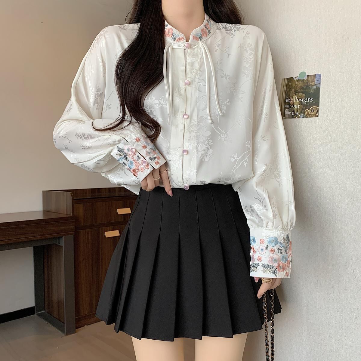 【送料無料】 レディース トップス ブラウス 刺繍 エンブロイダリー ふんわり袖 キュート フェミニン シンプル 大人かわいい レトロ フラワー スタンドカラー バンドカラー チャイナ風 リボン 長袖 ホワイト 白 20代 30代 40代 通勤 通学 オフィス お出掛け 女子会 お呼ばれ 秋冬