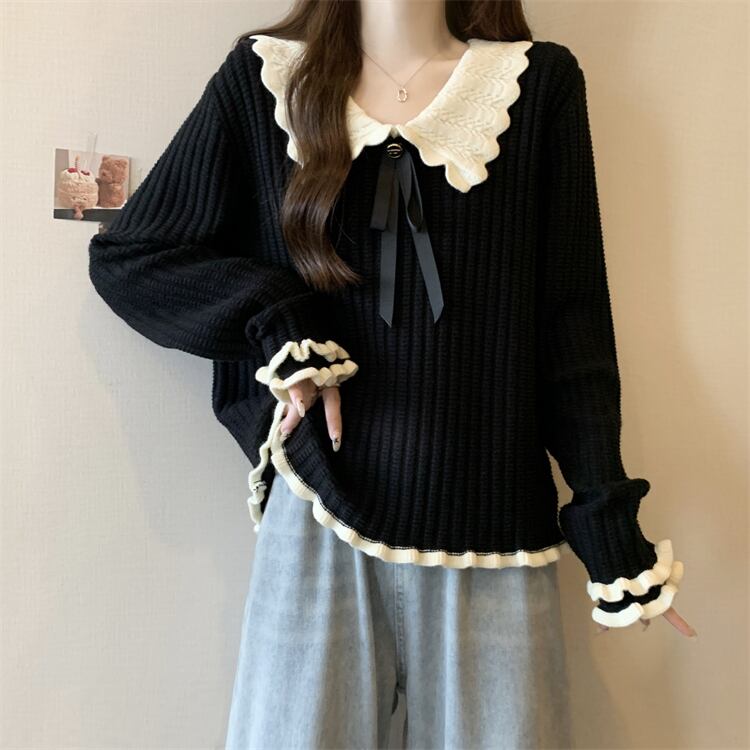 【送料無料】 レディース トップス ニット モノトーン カラー切り替え リボン 体型カバー キュート 大人かわいい こなれ感 スタイルアップ シンプル カジュアル きれいめ 長袖 ブラック 黒 20代 30代 40代 通勤 通学 オフィス お出掛け 女子会 お呼ばれ 秋冬