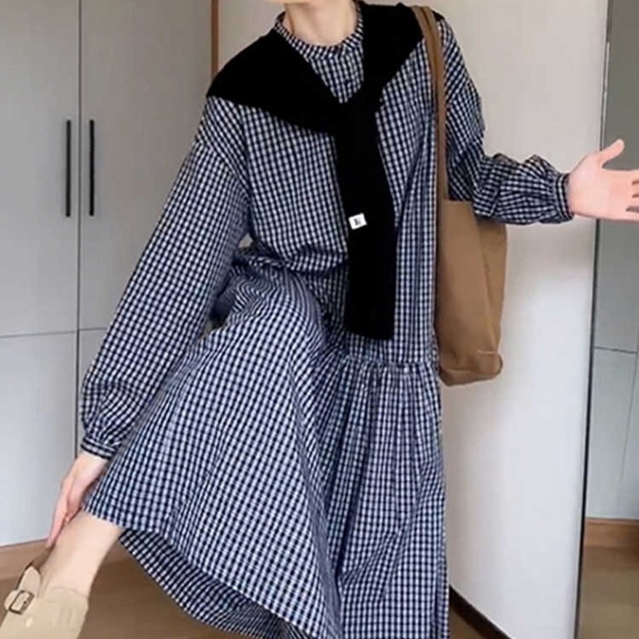 【送料無料】 レディース ワンピース チェック ミドル丈 ミディアム丈 ゆったり 体型カバー キュート シンプル カジュアル こなれ感 大人かわいい 抜け感 長袖 ブルー 20代 30代 40代 通勤 通学 オフィス お出掛け 女子会 お呼ばれ 秋冬