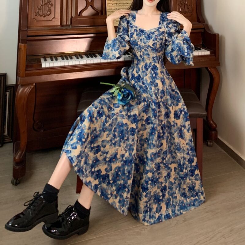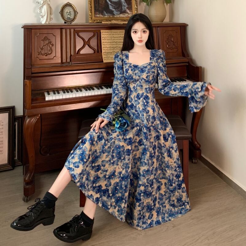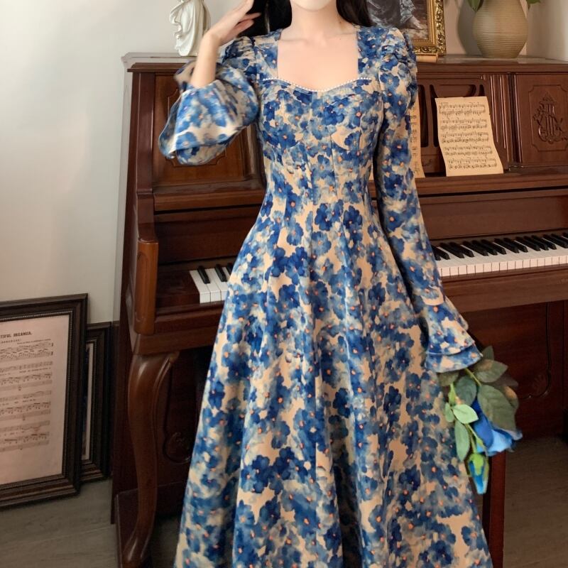 【送料無料】 レディース ワンピース ミドル丈 ミディアム丈 Aライン プリント フラワー ボタニカル スクエアネック ベルスリープ シンプル カジュアル きれいめ 大人かわいい 長袖 ブルー 青 20代 30代 40代 通勤 通学 オフィス お出掛け 女子会 お呼ばれ 秋冬