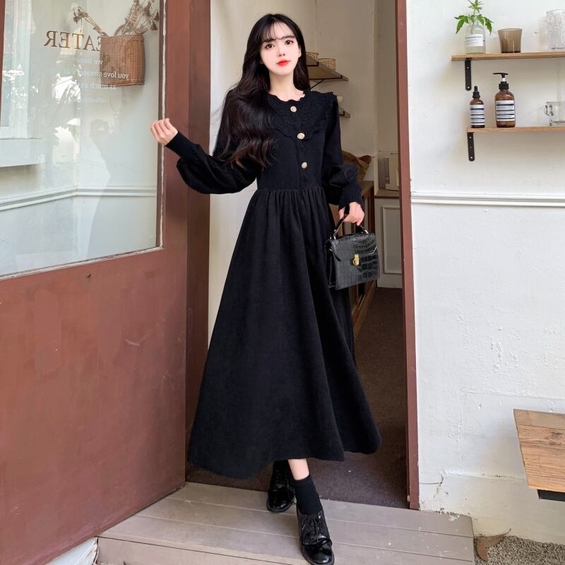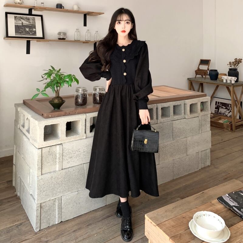 【送料無料】 レディース ワンピース ミドル丈 ミディアム丈 Aライン レトロ フェミニン 上品 ガーリー スウィート 大人かわいい シンプル カジュアル きれいめ こなれ感 長袖 ベージュ ブラック 黒 20代 30代 40代 通勤 通学 オフィス お出掛け 女子会 お呼ばれ 秋冬